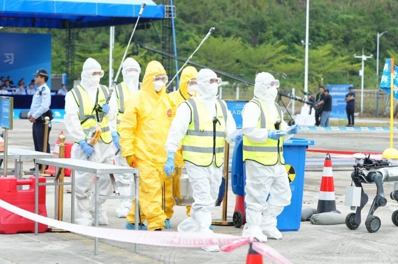 演习的一大亮点是运用无人机、机器狗等智能装备组合,实现了辐射热点监测与收贮的全面创新。演习融合空中优势与地面突破能力,实现了辐射热点空中速绘、障碍地形精准探测、低剂量源覆盖响应,构建起一张“空天地一体化”的无死角监测网络,全面展现了无人智能装备应用与多部门协同作战的现代化应急能力。