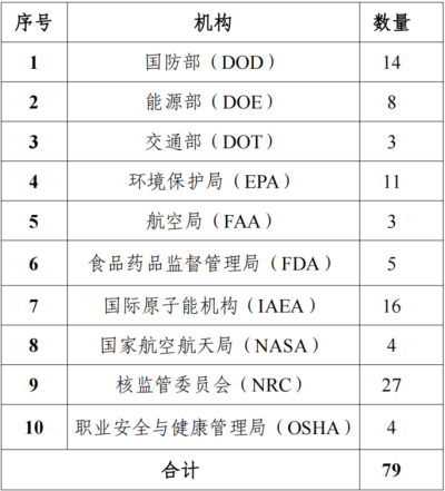 10个机构共出台了79项辐射防护法规标准,部分法规存在重叠,部分则相互矛盾。这些标准涵盖饮用水限值、大气排放、职业剂量限值、医疗剂量报告、应急照射指导、废物处置及性能要求等多个领域。