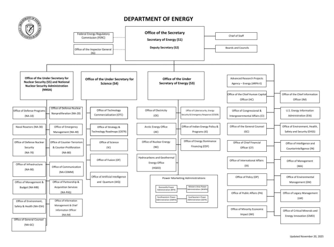 美国能源部(DOE)近日发布一项关于机构调整的新闻,旨在“扩大美国能源生产,加速科学和技术领导地位,并确保国家核武器库存的持续安全和准备状态”。本次调整主要涉及微调现有机构名称、设立新部门,以及取消部分原有机构。能源部新的组织结构图如下。