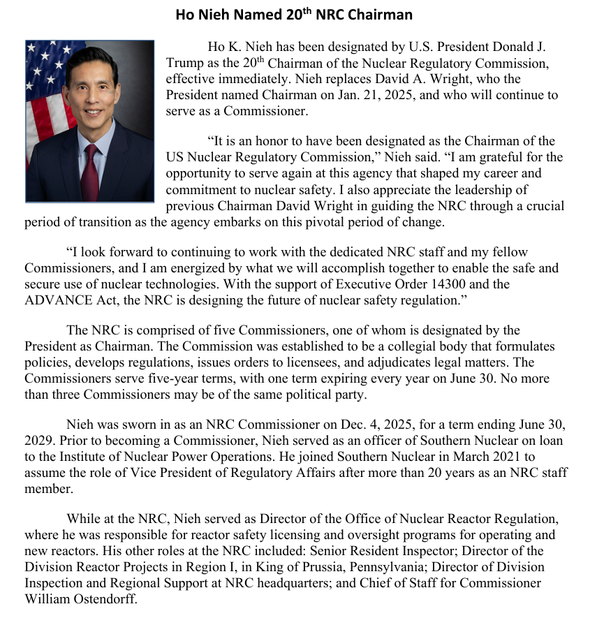 聂小庆已被特朗普正式任命为NRC第20任主席,接替于2025年1月21日被特朗普任命为主席的大卫·赖特,赖特将继续担任NRC委员。聂小庆于2025年11月19日被确认为委员,任期将持续到2029年6月30日。此次领导层变动发生在道格拉斯·韦弗于2025年12月获得委员确认之后不久,这也使委员会恢复到完整的五名委员配置。