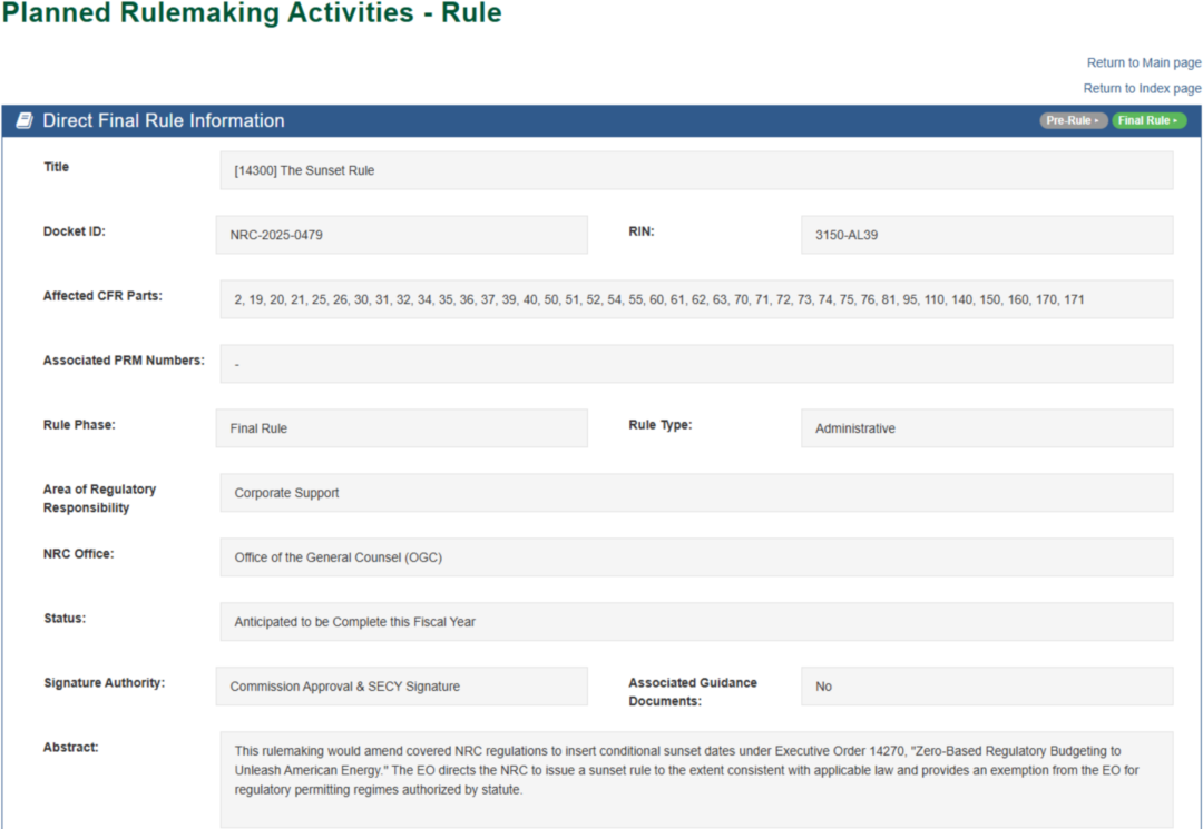 2025年12月11日,NRC宣布计划发布一项“日落法规”,旨在五年内实质上废除某些法规。此举是对特朗普第14270号行政令《通过零基监管预算释放美国能源潜力》的回应。