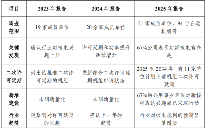 美国核能研究所(NEI)自2023年起定期发布《美国核电未来发展报告》,通过对其成员单位的系统性问卷调查,深入分析核电行业在许可延期、功率提升、新堆部署等活动的趋势和未来规划。该报告提供的相关数据和所反映的趋势,为政策制定者、投资者和公众提供了关于美国核电未来发展的重要参考。