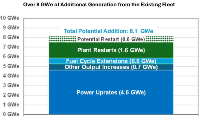 潜在新增总容量:8.1GW;潜在重启:0.6GW;机组重启:1.6GW;燃料循环延长:0.6GW;其他发电量提升:0.7GW;功率提升:4.6GW。