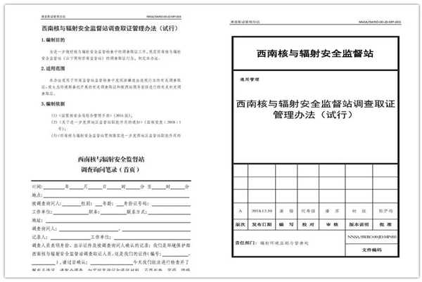 《办法》主要针对监督检查工作中发现涉嫌违法行为的调查取证、受国家核安全局委托调查取证和补充调查取证等工作作出规定,着力解决西南监督站缺少规范调查取证程序、监督员因自身经验和理解等原因造成调查取证差异化较大等问题。西南监督站将调查取证管理文件的编制作为站监督文件框架体系建设的重点内容,组织相关人员充分调研酝酿、全站参与讨论并邀请行业专家进行审查。在多次讨论易稿后,《办法》通过西南监督站主任会审议并正式印发实施。