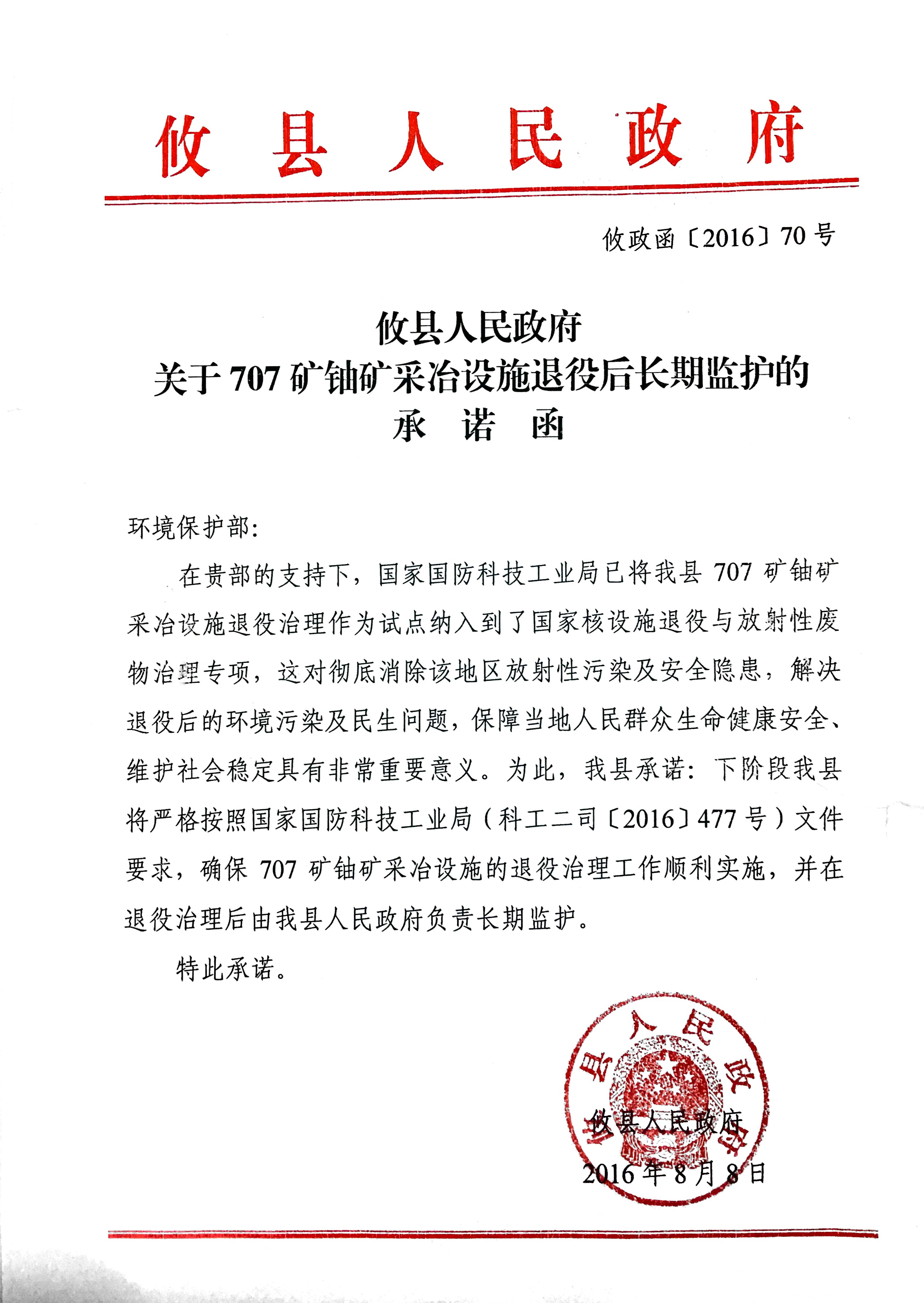 攸县人民政府关于707矿铀矿采冶设施退役后长期监护的承诺函