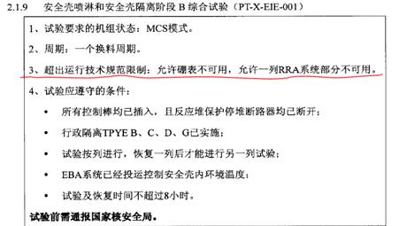 《安全壳喷淋和B阶段隔离综合试验》FQ1-EIE-T-001为周期1C的超规范试验,《福清核电厂1、2号机组安全相关系统和设备定期试验监督要求》规定,该试验期间的超出规范限制为“允许硼表不可用(第1组I0),允许一列RRA部分不可用(第1组I0)”,具体见图1所示: