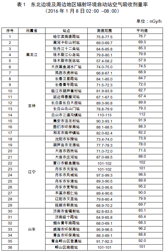截至到1月8日08时,在东北边境及周边地区布设的36个辐射环境自动监测站实时连续空气吸收剂量率监测结果处于当地本底范围内。监测数据见表1。