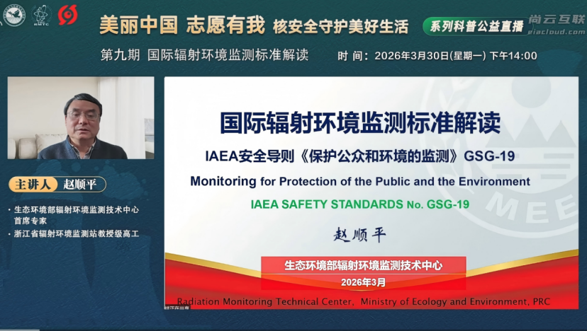 在“4・15”全民国家安全教育日来临之际,为深化核安全科普传播、提升公众对辐射环境监测标准的科学认知水平,中国核安全与环境文化促进会(以下简称文促会)联合生态环境部辐射环境监测技术中心成功举办“美丽中国 志愿有我——核安全守护美好生活”第九期科普公益直播暨核平卫士第四期大讲堂。本次直播邀请生态环境部辐射环境监测技术中心首席专家赵顺平担任主讲嘉宾,专业解读国际辐射环境监测标准核心内涵,阐释我国辐射监测体系与国际标准的衔接要点,引发社会各界广泛关注。