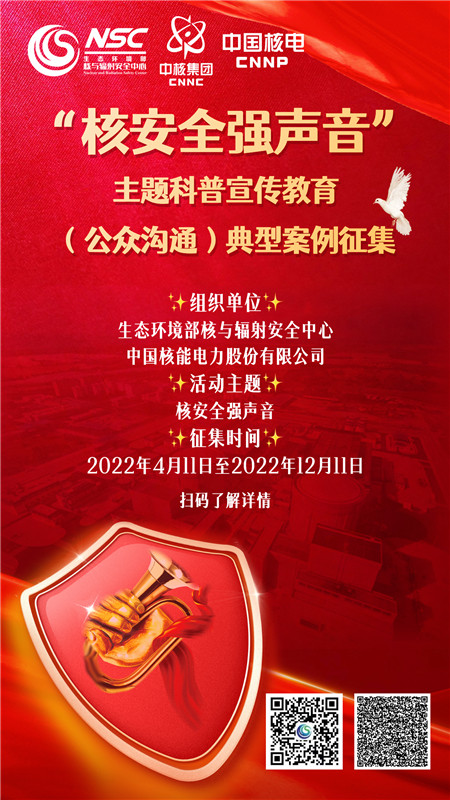 为坚持和贯彻总体国家安全观、核安全观,强化核安全法律宣传和知识普及,提升全民国家安全和核安全意识,推进核能核技术领域贯彻“安全第一,质量第一”方针,弘扬核安全精神、核工业精神、核安全文化,营造全行业全社会共同维护核安全的良好氛围。推动核能核技术利用事业安全高效、创新高质量发展、可持续发展,助力生态文明、美丽中国建设。中心联合中国核能电力股份有限公司拟开展征集“核安全强声音”主题科普宣传教育(公众沟通)典型案例活动,大力宣传展示核能核技术行业核安全成就,为社会各相关方开展核安全相关公众沟通、科普宣传教育提供经验借鉴和资源共享。有关情况概述如下: