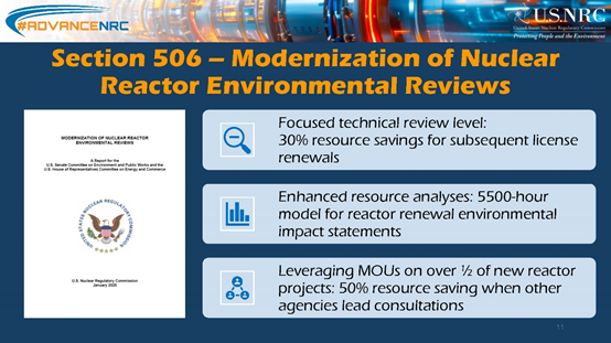 2025年1月NRC向国会提交了《核反应堆环境审查现代化》报告,充分利用已有环评报告结论,扩大环评报告使用范围,加强机构协调,简化替代方案分析,建立类别排除清单,推动数字化与公众参与,修订联邦法规10CFR第51篇,更新环境审查指南及相关政策要求。