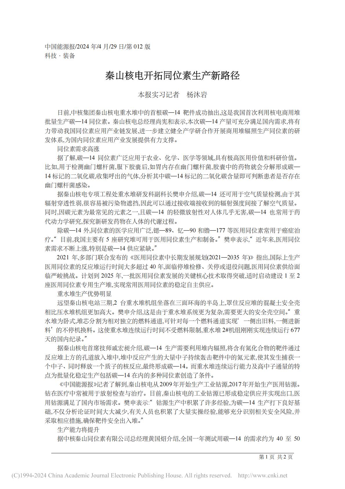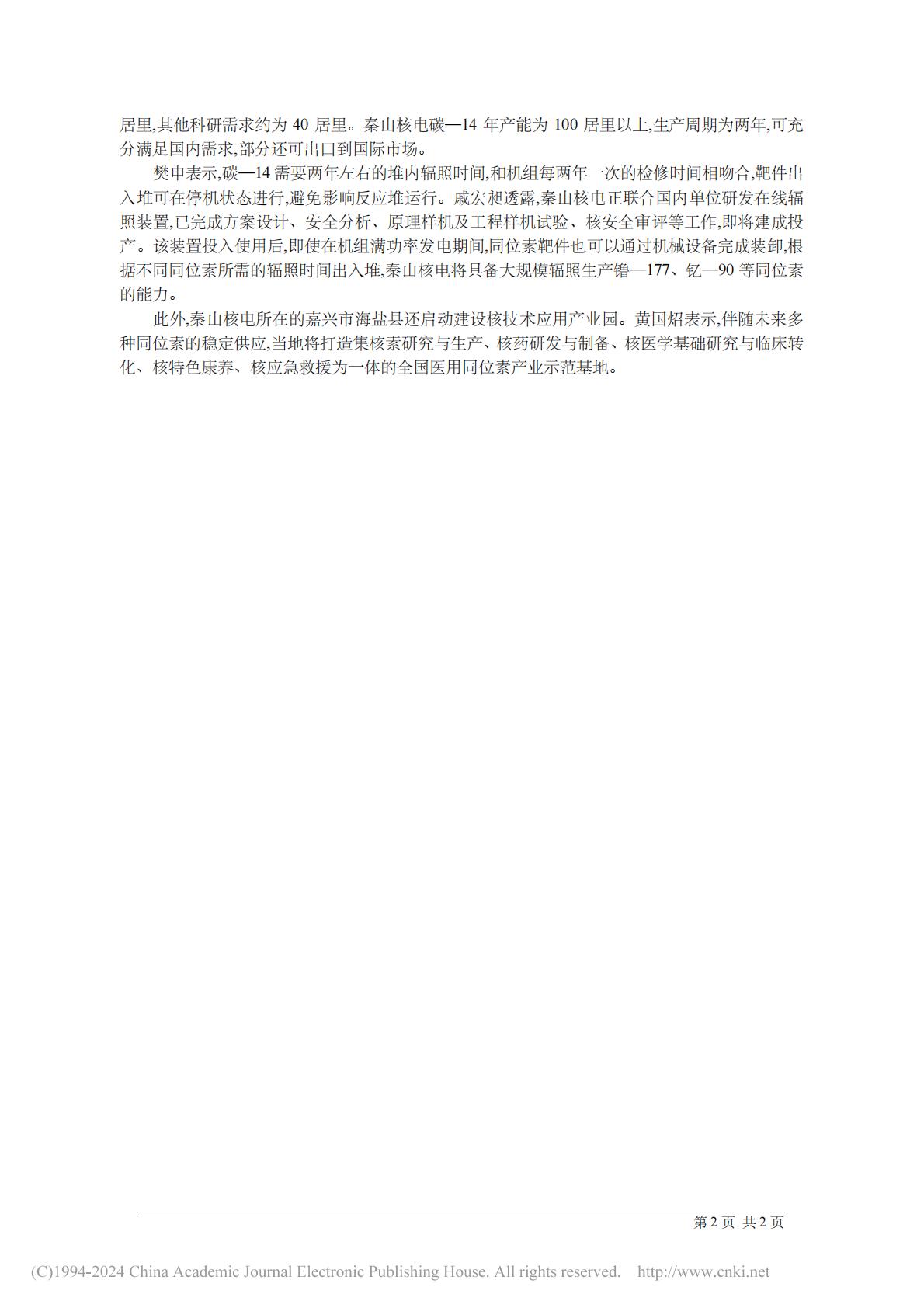 秦山核电开拓同位素生产新路径